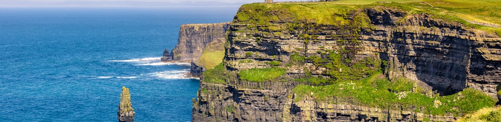 Sitúate en la cima de los acantilados de Moher, visita el centro de visitantes interactivo y admira los impresionantes paisajes irlandeses.