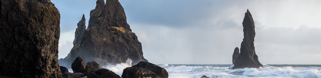 Tanto las excursiones de un día desde Reikiavik como los tours de varios días con diferentes etapas, son buenas opciones para descubrir esta zona de Islandia. Además de la playa de arena negra, este territorio ofrece paisajes impresionantes, como una curiosa pared rocosa formada por columnas de basalto, acantilados enormes, cuevas ocultas y los increíbles pilares de roca de Reynisdrangar, que sobresalen del océano al lado de la montaña Reynisfjall.